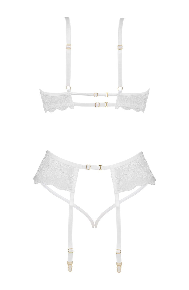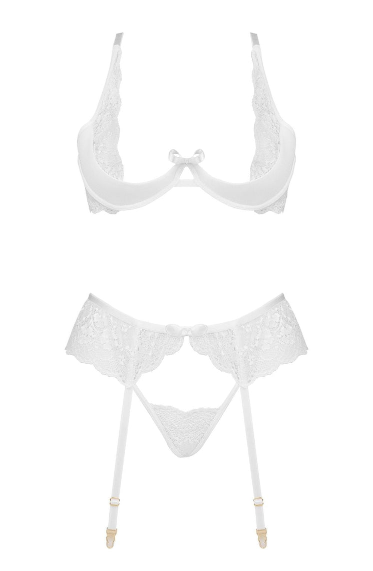 Discover the sensual Rose Set white, an exquisite lingerie set featuring a bra, thong, and garter belt. Crafted from delicate white lace, this alluring design enhances your natural beauty, making you feel feminine and sexy. Perfect for romantic evenings or as a special gift.
