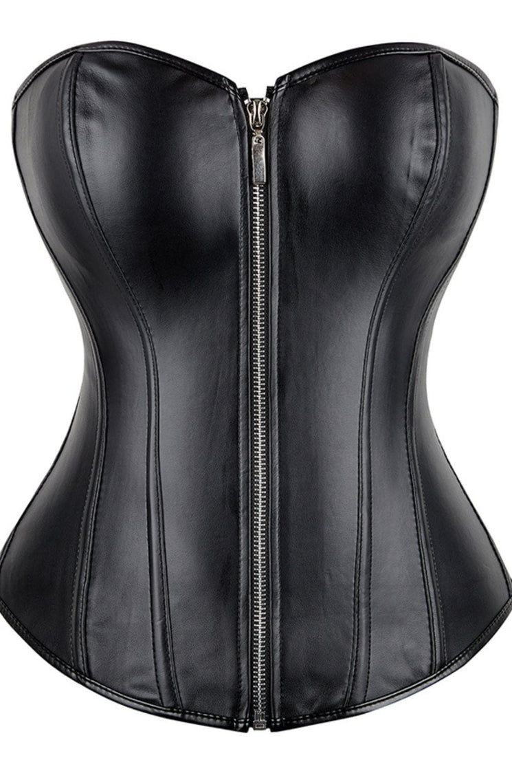 Make a bold statement with this sleek black leather-look corset, designed to sculpt and flatter your figure with edgy sophistication. Featuring a smooth faux leather finish, a secure front zip closure, and an adjustable lace-up back, this corset offers both fashion and function in one stunning piece.