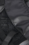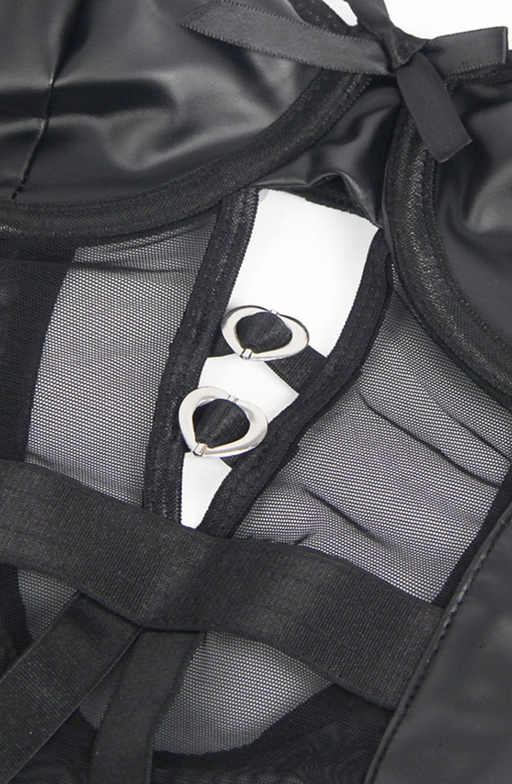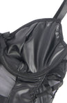 This striking black bodysuit combines bold faux leather panels with delicate sheer mesh for a daring yet sophisticated look. Featuring a structured underwire bust, side lace-up detailing, and adjustable shoulder straps for the perfect fit.